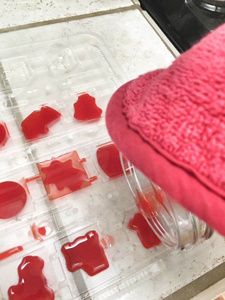 - Carefully pour melted wax into ice cube tray or advent calendar form. Hint: when using ice cube tray only fill each about half an inch.