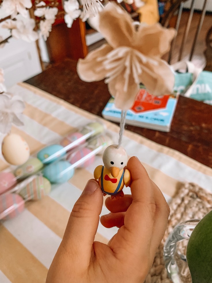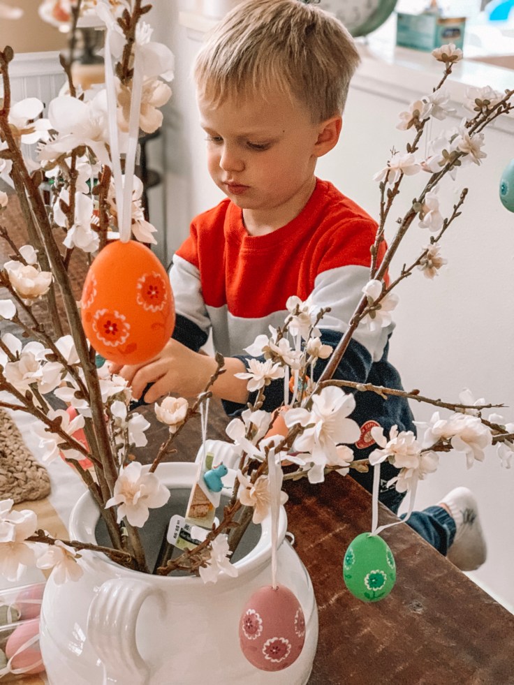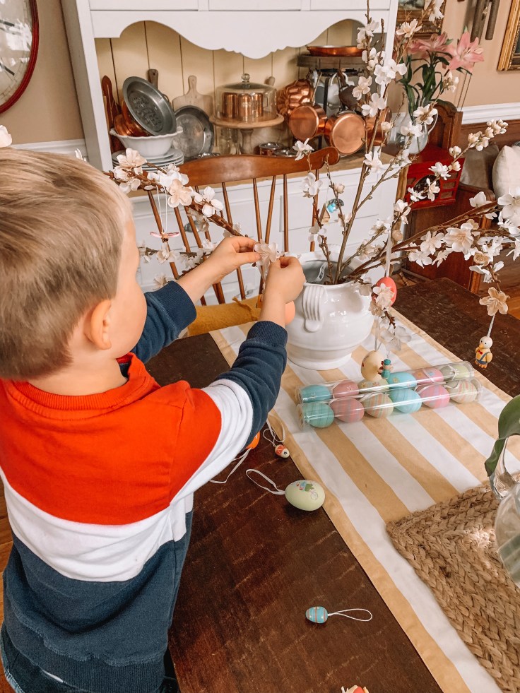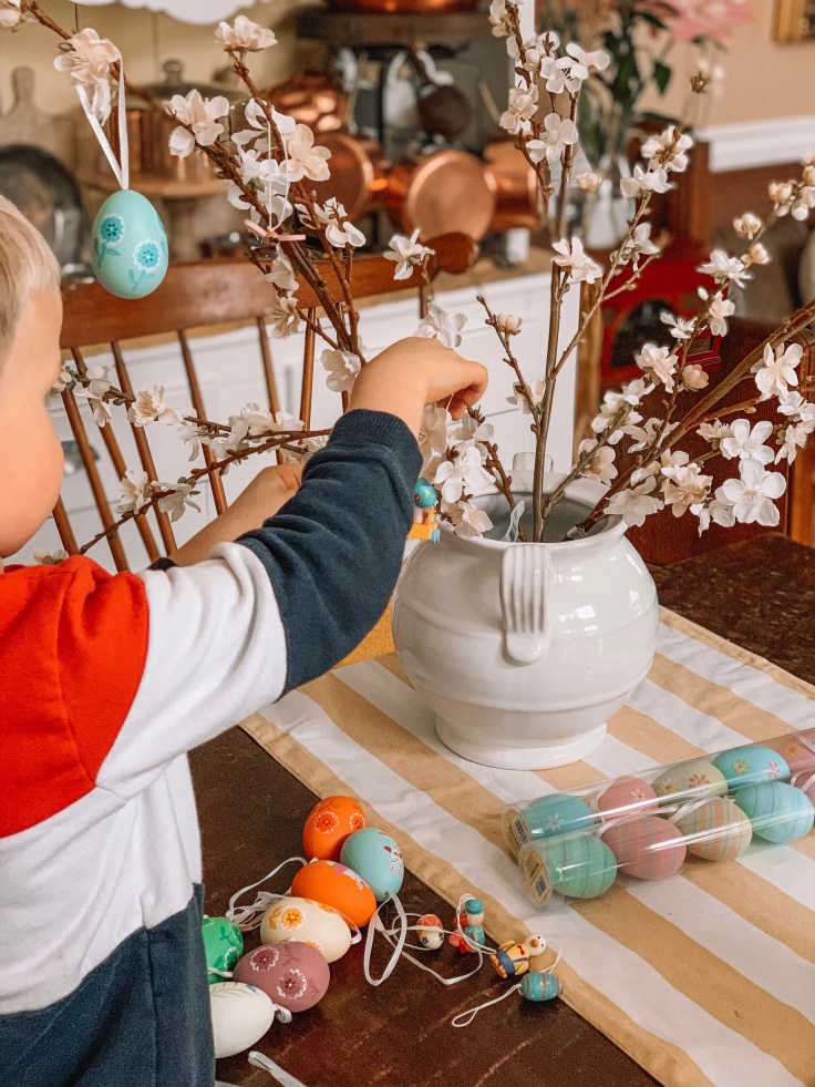 And inside the home the Easter egg tree make a lovely centerpiece or the Easter table, or a beautiful decoration for the sideboard. And it’s so easy to make your own. All you need is a free branches which can either be found in nature or bought at any crafts store or even grocery store. We bought ours at Michael’s this year. Three branches for about $10. And decorations – even authentic German decorations – at World Market. But even Amazon has branches and decorations that can be used.