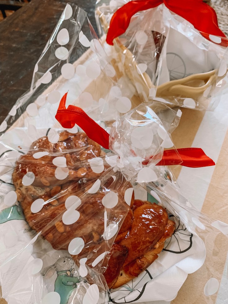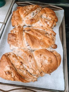 We cut the braided dough into three pieces so we can share it with our neighbors. But you don’t have to. You can also braid it into a wreath shape and fill it with colored eggs… or even bake the hard boiled colored eggs into the braid.