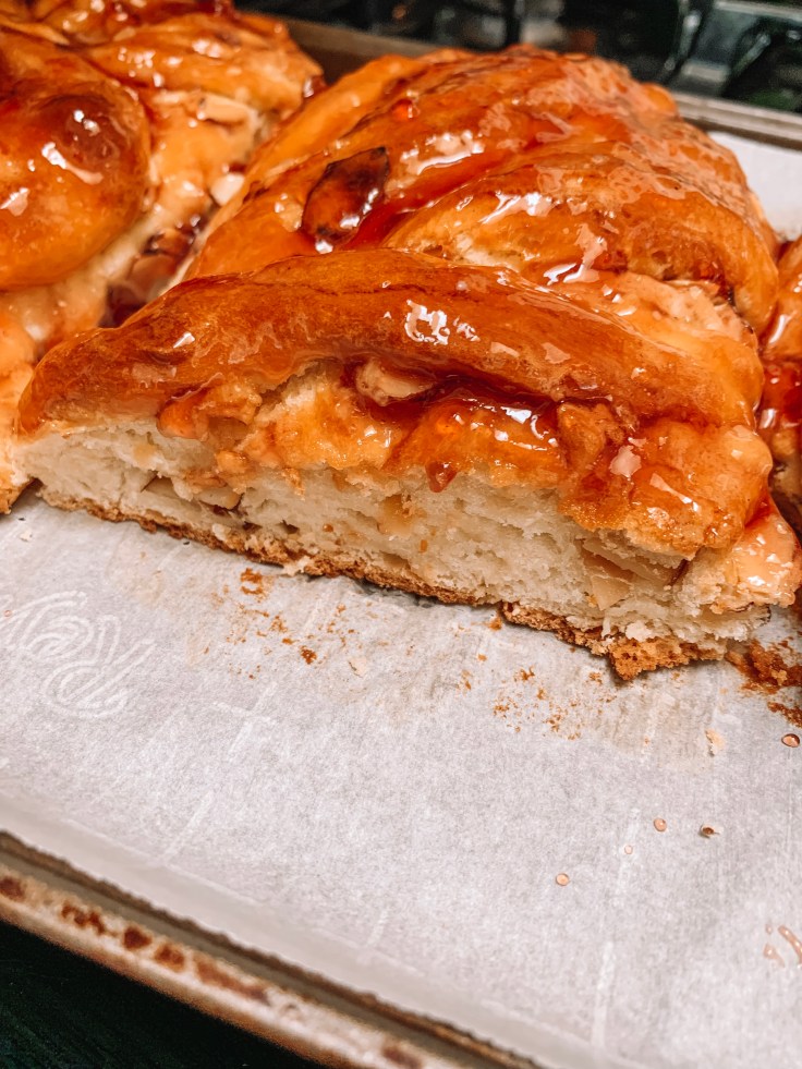 Instructions: Preheat oven to 375 degrees. Place yeast into a bowl and add a little bit of milk and the sugar beating it until smooth. Add egg, egg yolks, the rest of the milk, sea salt and flour and beat in a kitchen mixer on low speed for about 3 minutes. Beat on high speed for an additional 5 minutes. Add butter chunks one at a time while continuing to beat the mixture on high speed. Continue to beat the mixture on high speed for an additional 5 minutes until the dough is of soft, smooth consistency. Cover with a cloth and place in a warm place (we turned the oven on for a few minutes and turned it off before placing the dough inside). Let rise for 1 hour. While the dough is rising, place sliced almonds into a pan and toast them without oil until golden brown. Let them cool.