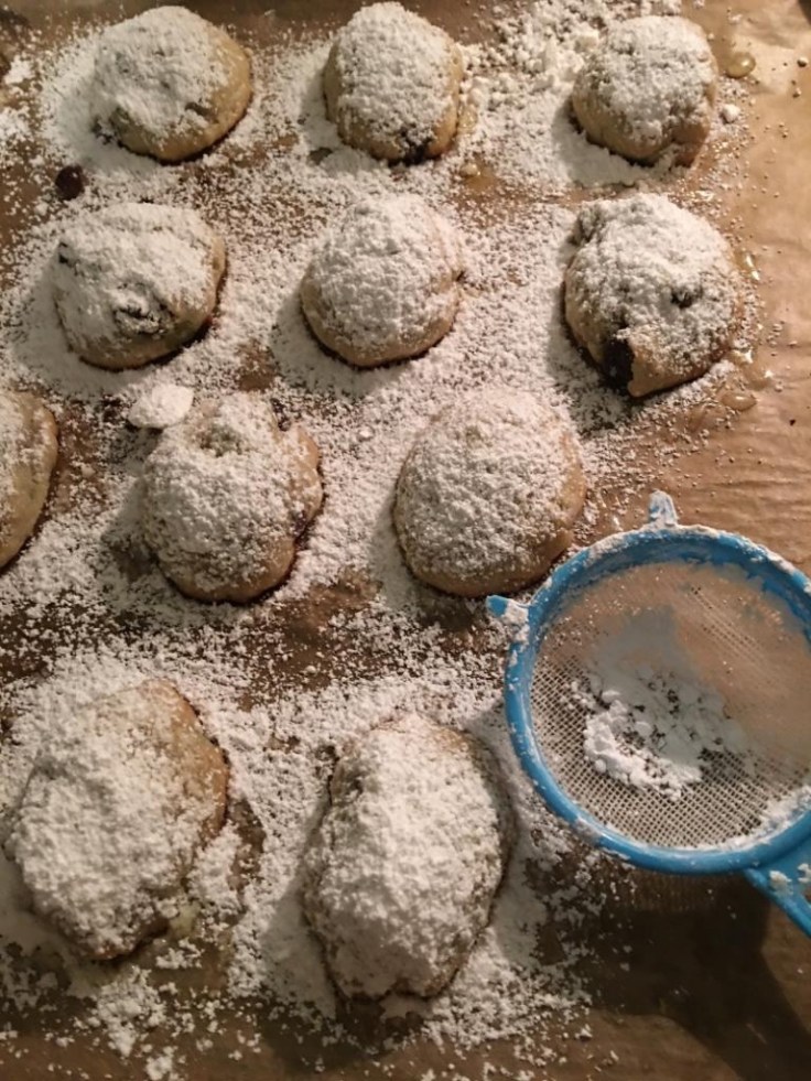 - When the dough pieces are finished baking, pull them out of the oven and while they are still hot roll them in the melted butter and the powdered sugar until they are completely covered. (You can also just dust them heavily.)
