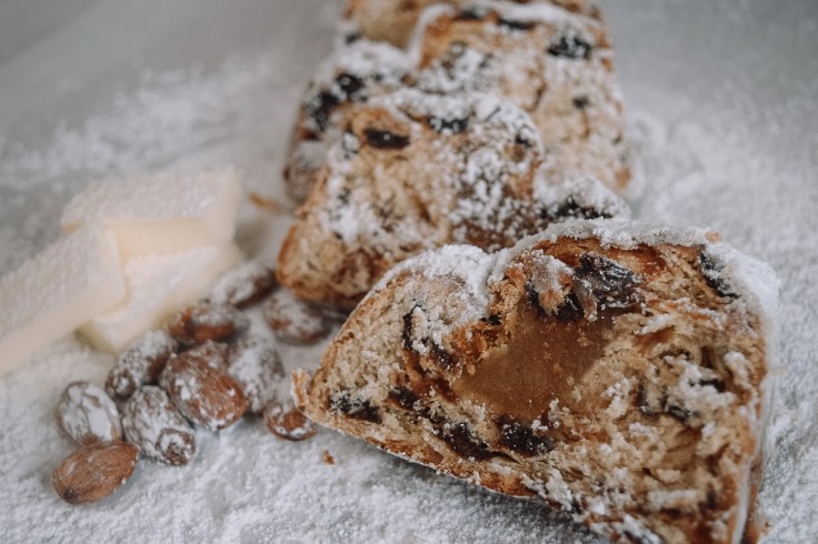 Stollen, pronounced ‘shtaw-lehn,’ is a cake-like fruit bread made with yeast, flour and water as well as zest which is added to the dough. There are dozens of variations when it comes to Stollen such as Mandelstollen (which includes almond), Mohnstollen (which includes poppy seed), Quarkstollen (which includes curd), Nuss-Stollen (which includes nuts), Butterstollen (which includes a large amount of butter), Dresdner Stollen and Marzipanstollen (which includes marzipan).