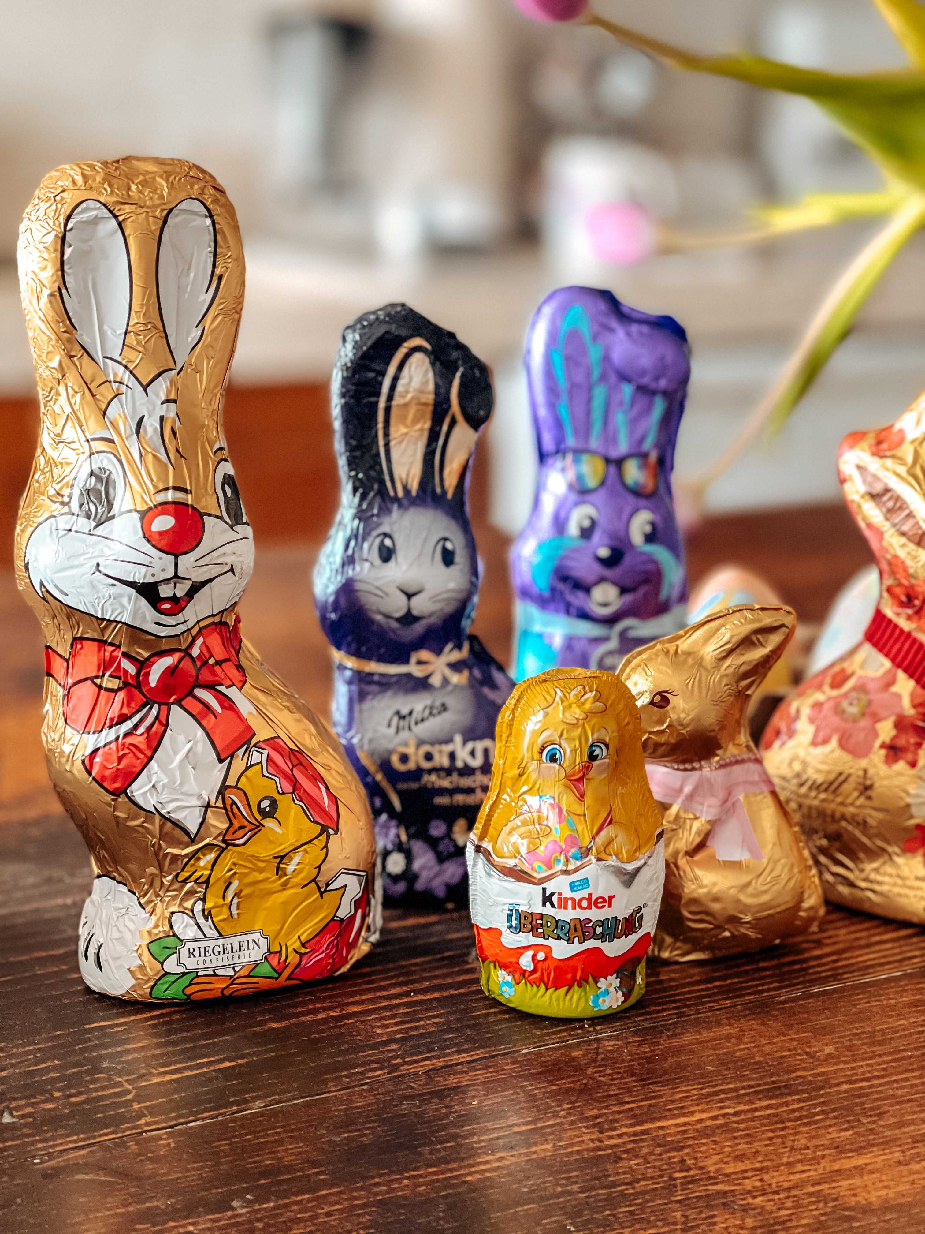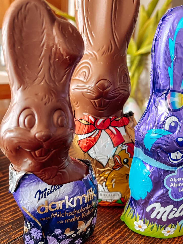 But, in my opinion, the most glorious of all of them comes foil-wrapped and with two big ears – the Schokoladenosterhase or chocolate Easter bunny. Ideally in milk chocolate. Ideally wrapped in a shiny purple foil and ideally with the word Milka written on it. Yes, the Milka Lila Schmuzelhase is my all-time favorite. No Easter is complete without it.