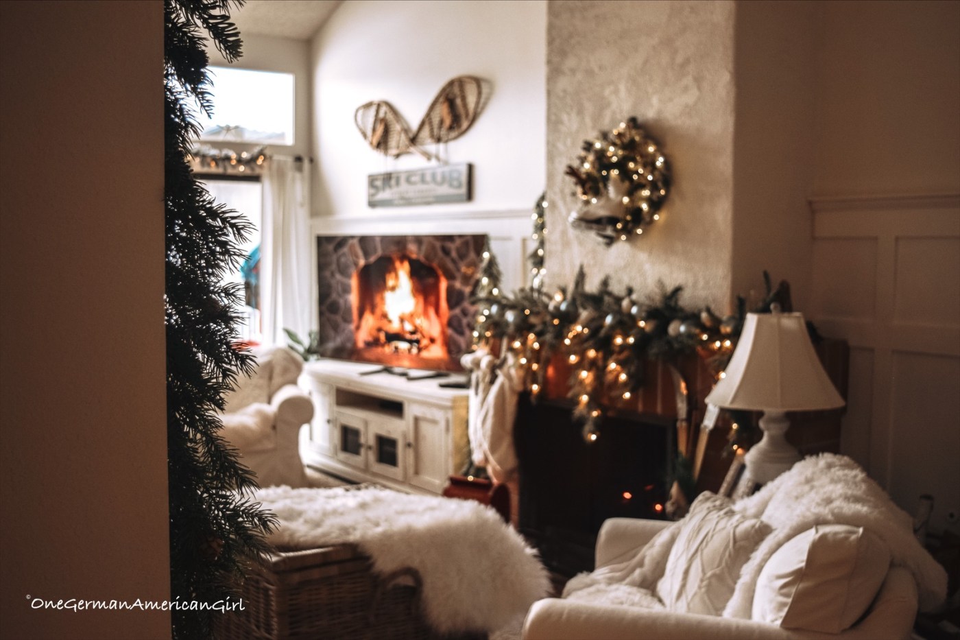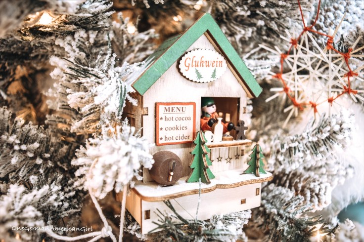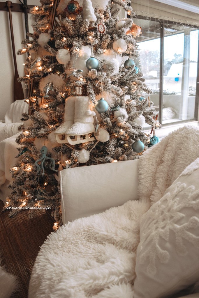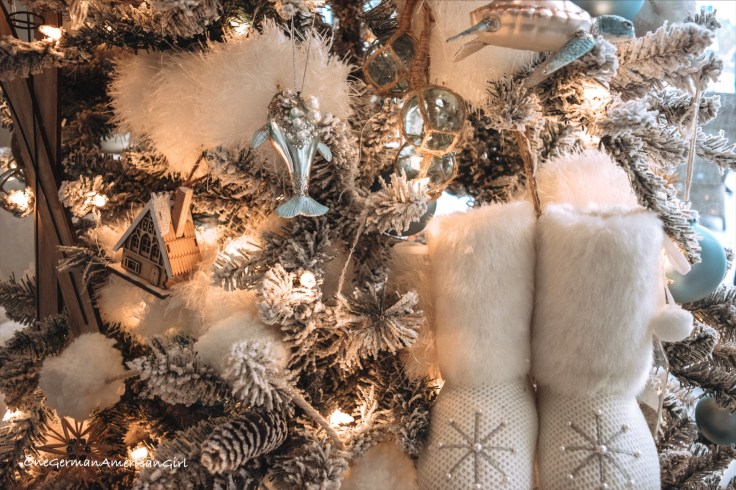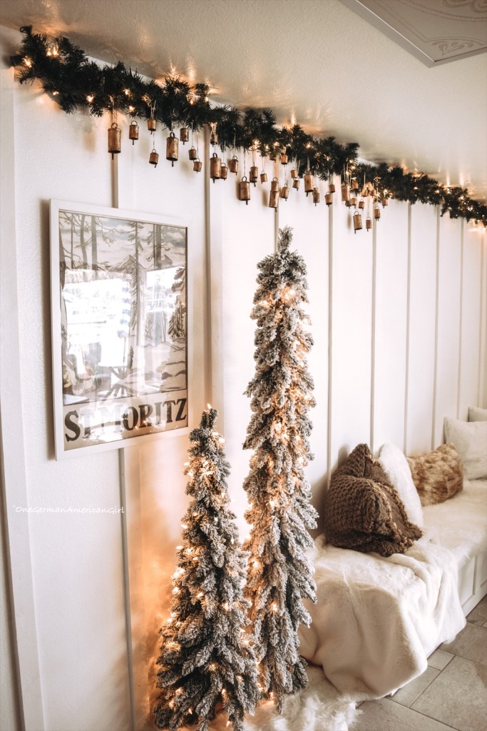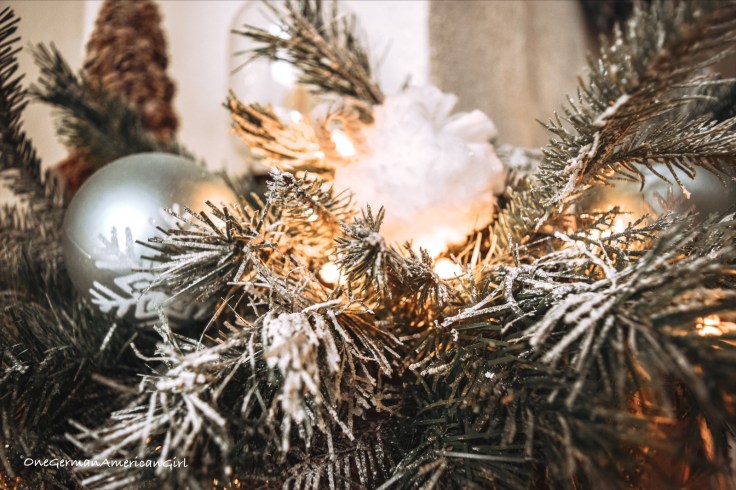 In the family room, it is as close you can get to a white Christmas in the snow-covered Alps! The tree features ornaments from Kohl’s, Hobby Lobby and some vintage German ornaments, like Strohsterne.