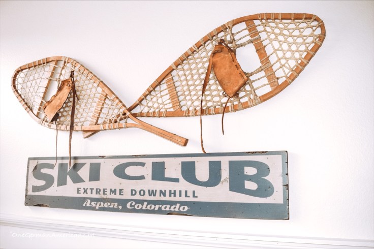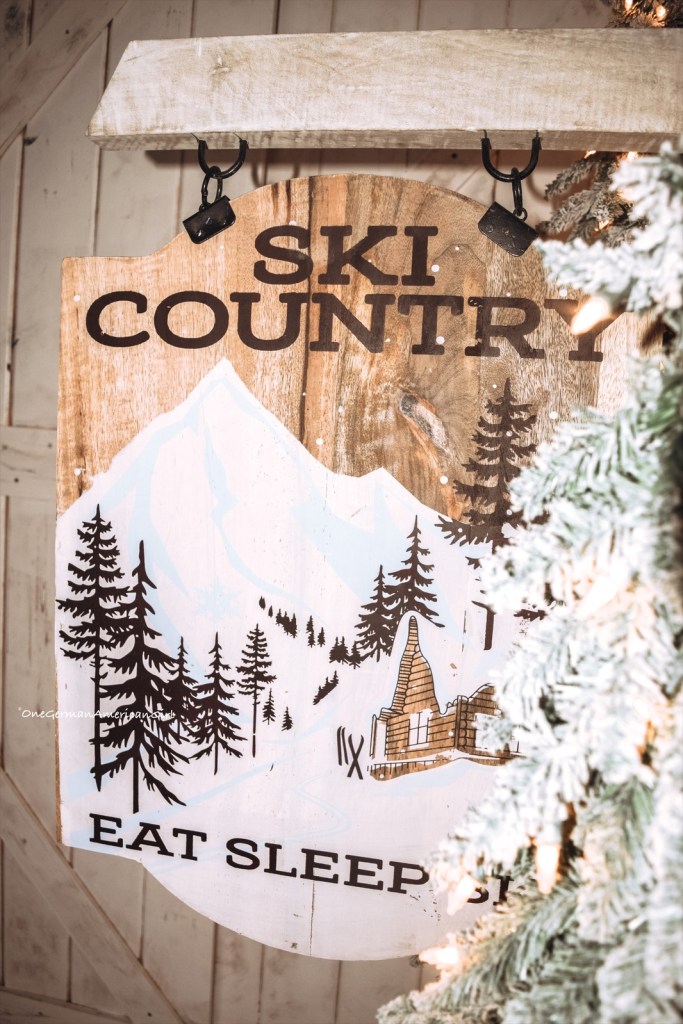 In the entry way, a pair of flocked Christmas trees from Hobby Lobby greets visitors along with wooden skis and a large wooden ski country sign which I also discovered at Home Goods. To cover up the bases of the trees and sign, I used a faux fur rug from Amazon.
