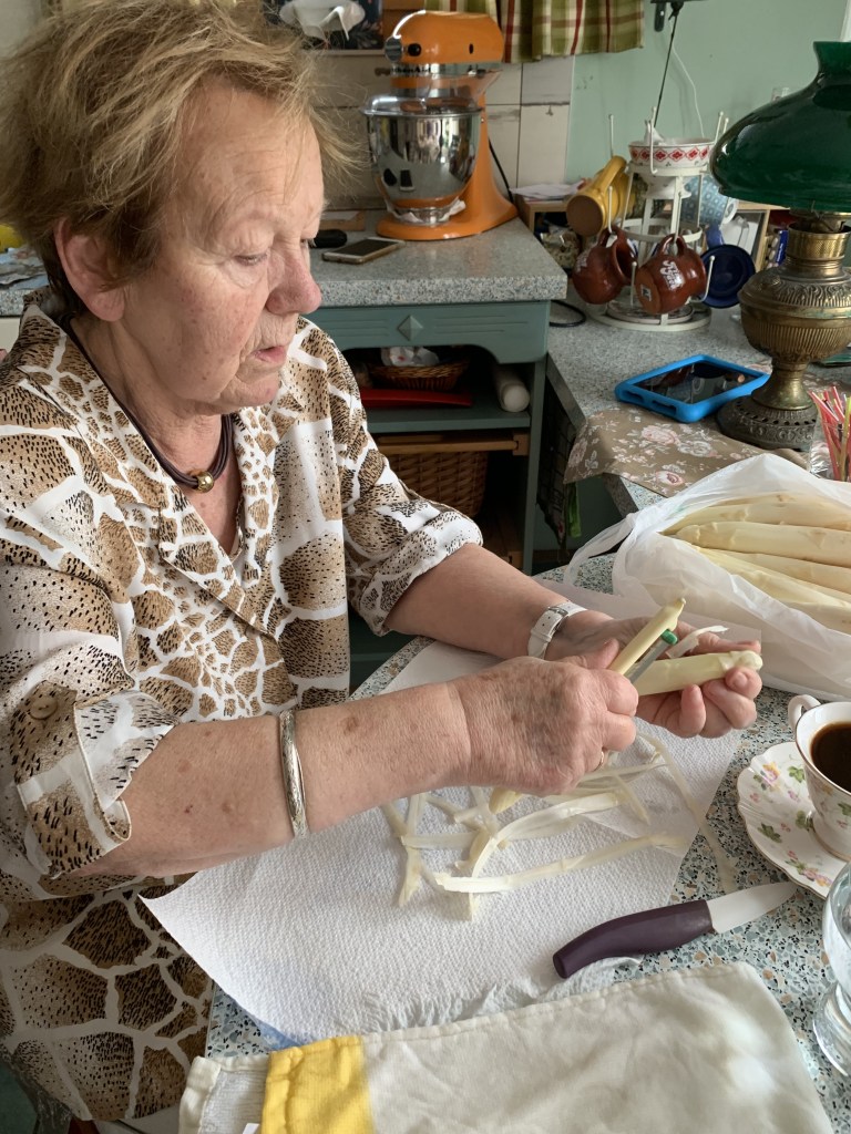White asparagus tends to be thicker than the green variety and making sure to peel and cut it right takes a little bit of a learning curve. In our family, my Oma is definitely the one who has the magic hand. Her asparagus always comes out melt-in-your-mouth tender. If not peeled and cut right, white asparagus can taste holzig or woody.