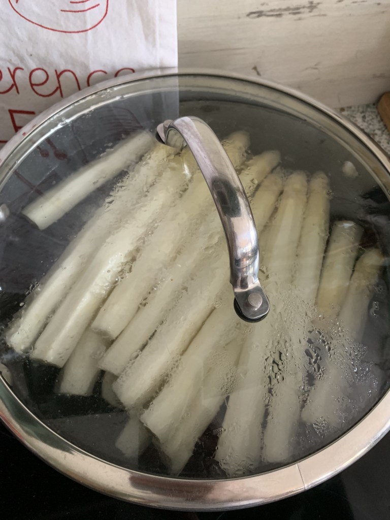 Before cooking white asparagus, simply peel the asparagus with a peeler leaving the tip intact. How much needs to be taken off depends on each individual spear. Using a small knife, also cut the bottom a little. Traditionally, white asparagus is boiled in salt water and smothered in hollandaise sauce in our house or topped with brauner butter or brown butter. Braune butter is easy to make by simply heating butter in a little pan over the stove and adding bread crumbs after the butter is melted and stirring it until the bread crumbs have absorbed all of the liquid. Just don’t forget to stir, otherwise the butter will burn.
