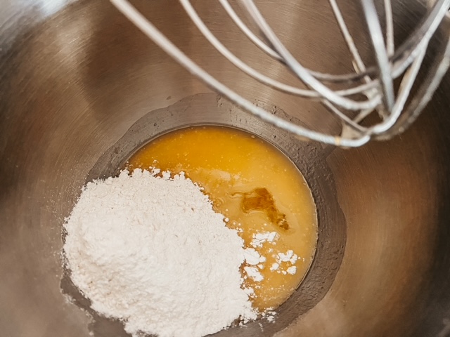 - Add the melted butter and mix again until combined.