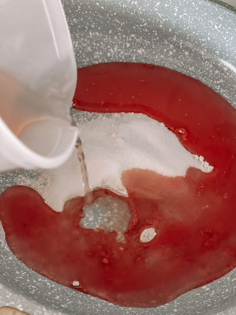 - Using the strawberry juice from the bowl and adding additional water along with the two tablespoons of sugar, make the Tortenguss (it can be bought on Amazon).