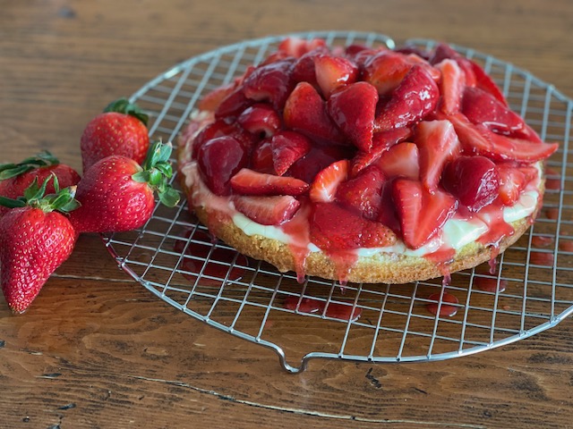- While still hot, drizzle the Tortenguss over the strawberries beginning in the middle.