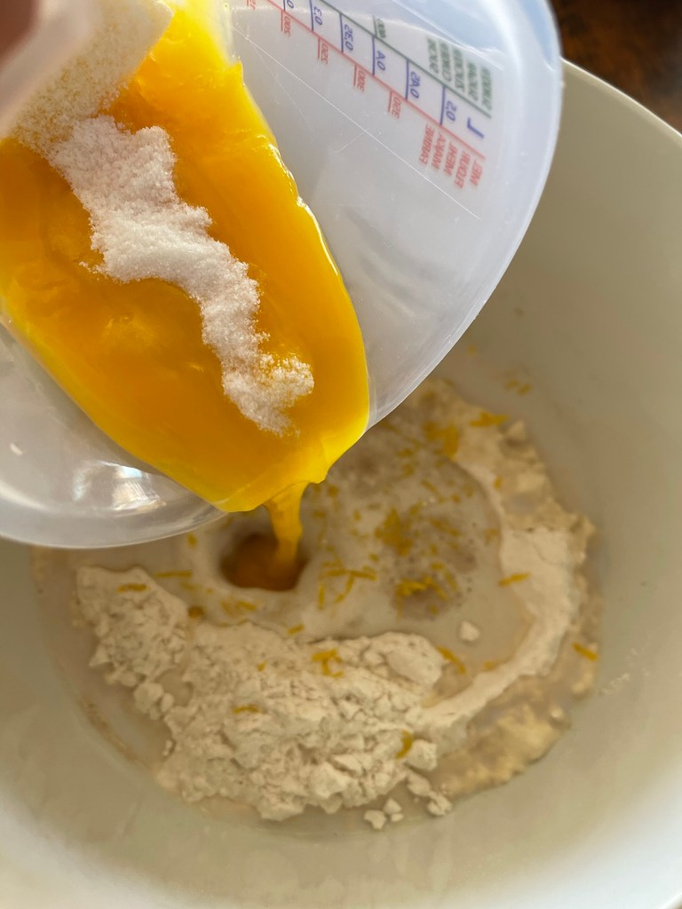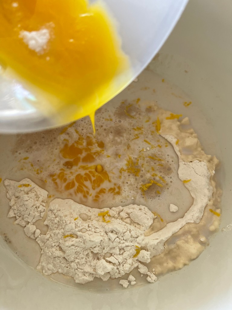 - Add the remaining ingredients to the flour, except for the butter and eggs.