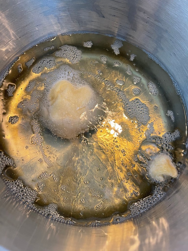 - Cut the tip of the ziplock bag and push the tip into the Pfannkuchen on the side and fill it with the jam or vanilla pudding – about 1/2 to 1 teaspoon.