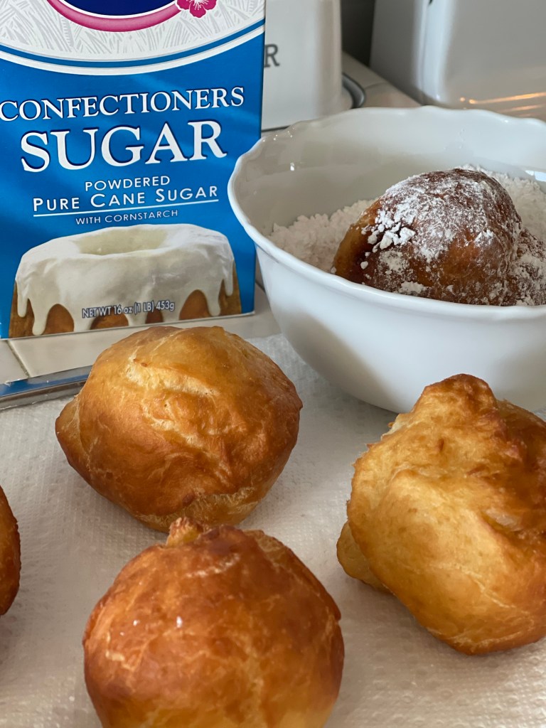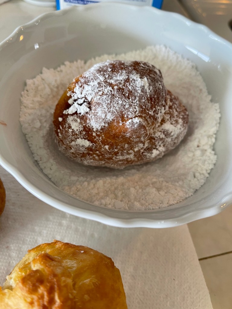 - When all Pfannkuchen are baked and slightly cooled, roll each one in a bowl of powdered sugar.