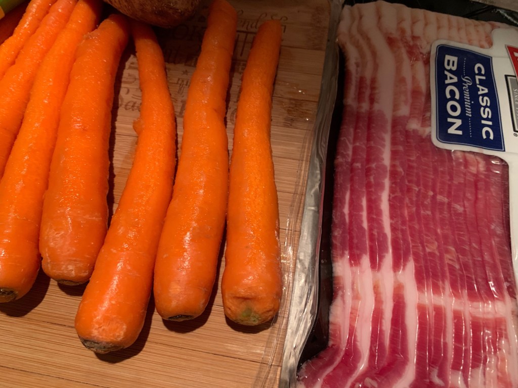 - Wrap each apple with 1 slice of bacon (or as much bacon as necessary to cover the apple) and secure each with 2 cloves.