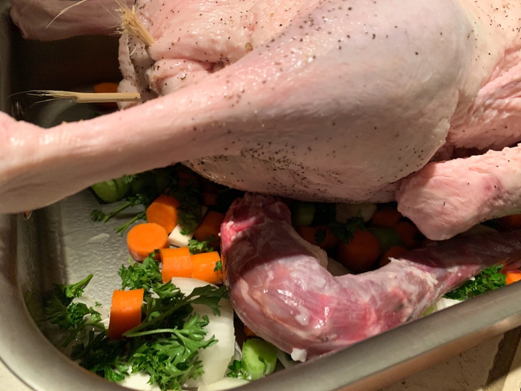 - Season the goose with salt and pepper inside and out (don’t be shy with the salt) and also marjoram on the inside.